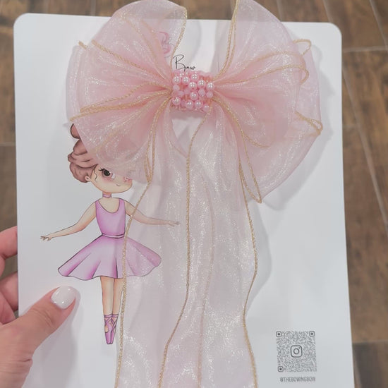 Ballet-Inspired Design: The pinkish-purple bow boasts a sheer fabric with gold trim and pearl details, evoking the elegance of a ballerina.
