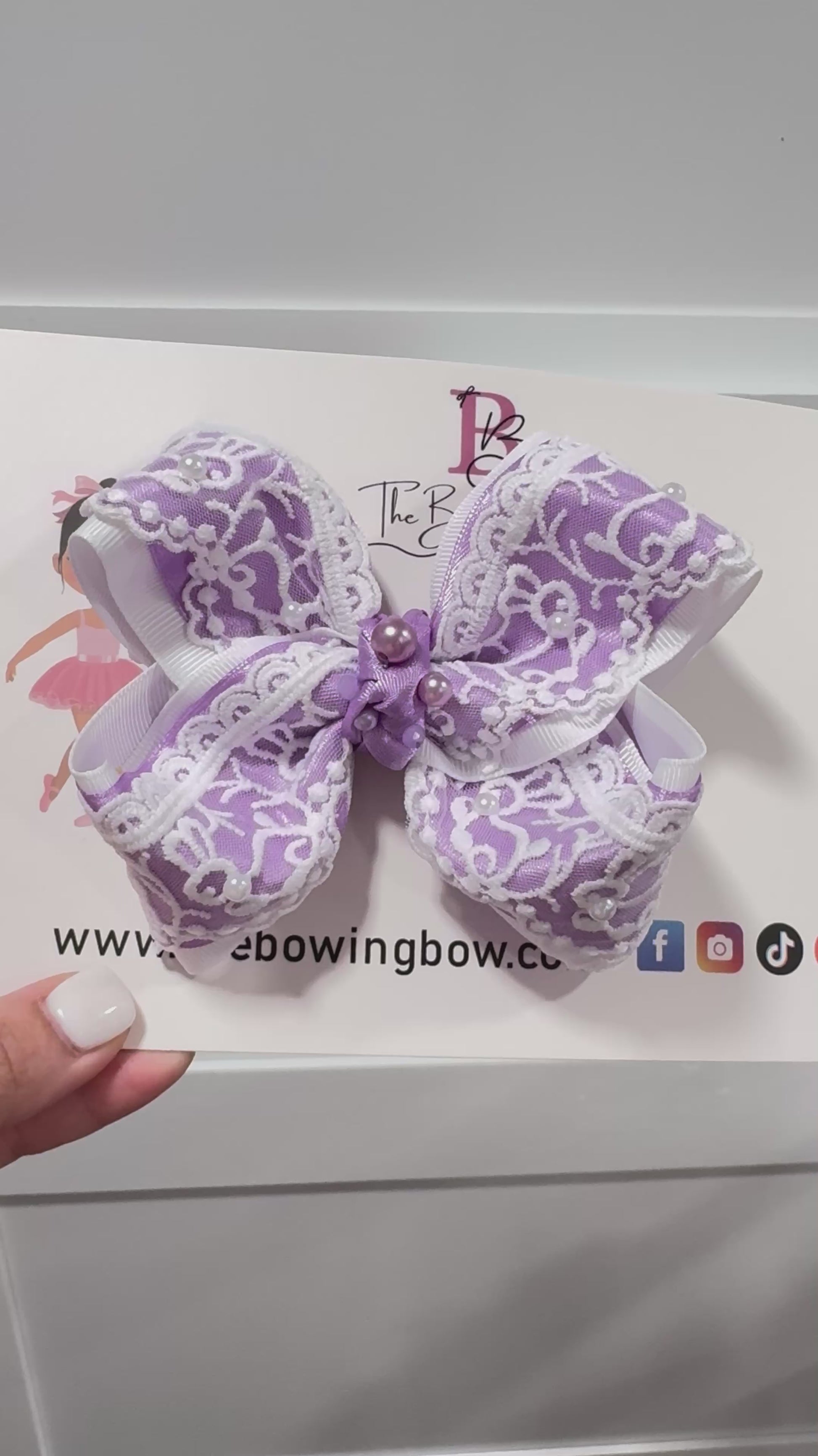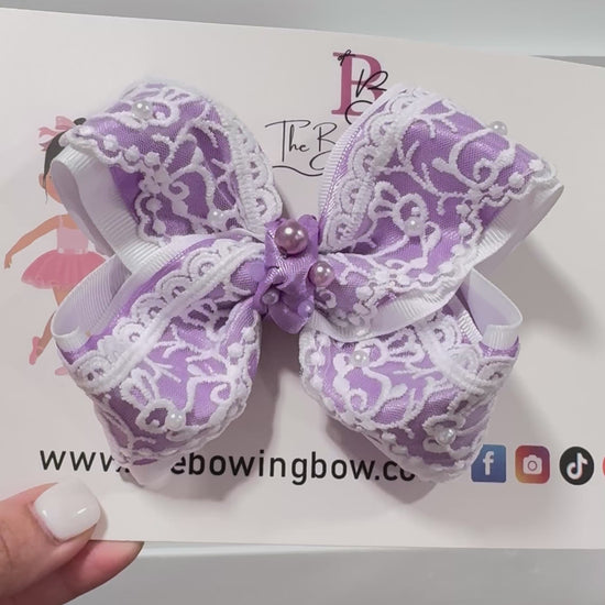 Bunny Lace Hair Bow . Comes in 4 and 5 inches. Either on a headband or an alligator clip. You can pick a different ribbon color to match with the bunny Lace. Bunny Lace is always white the color that changes is grosgrain underneath the bunny Lace ribbon.