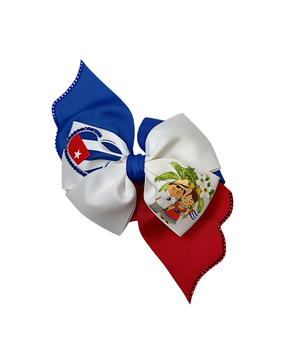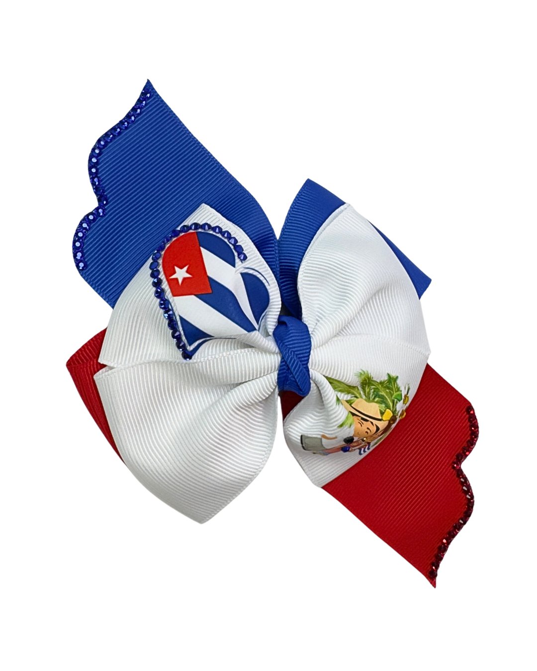 Crafted with premium grosgrain ribbon in the iconic red, white, and blue of the Cuban flag, this bow features unique artistic touches that set it apart from the rest.