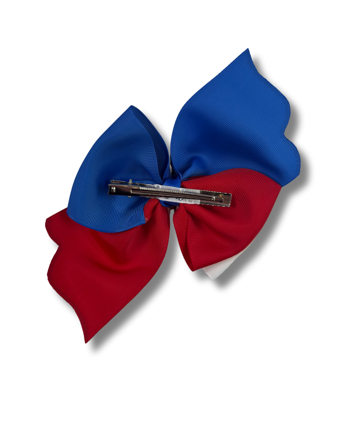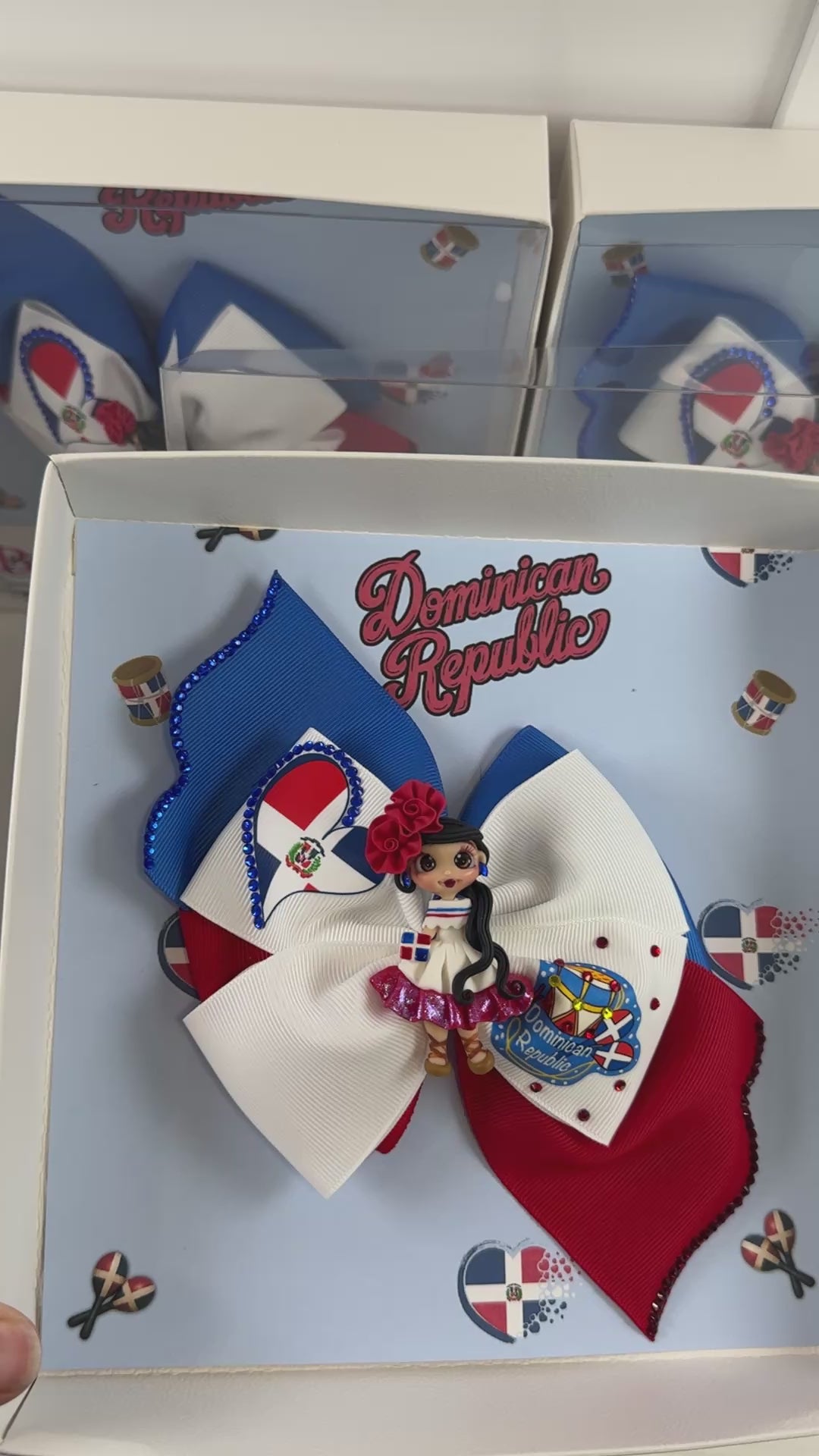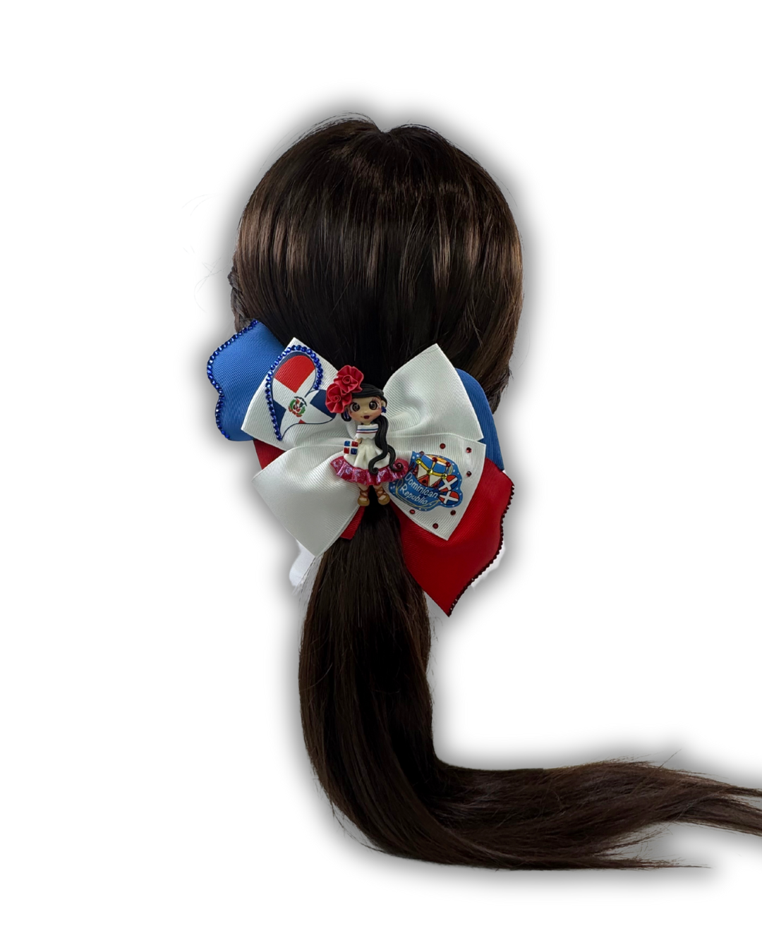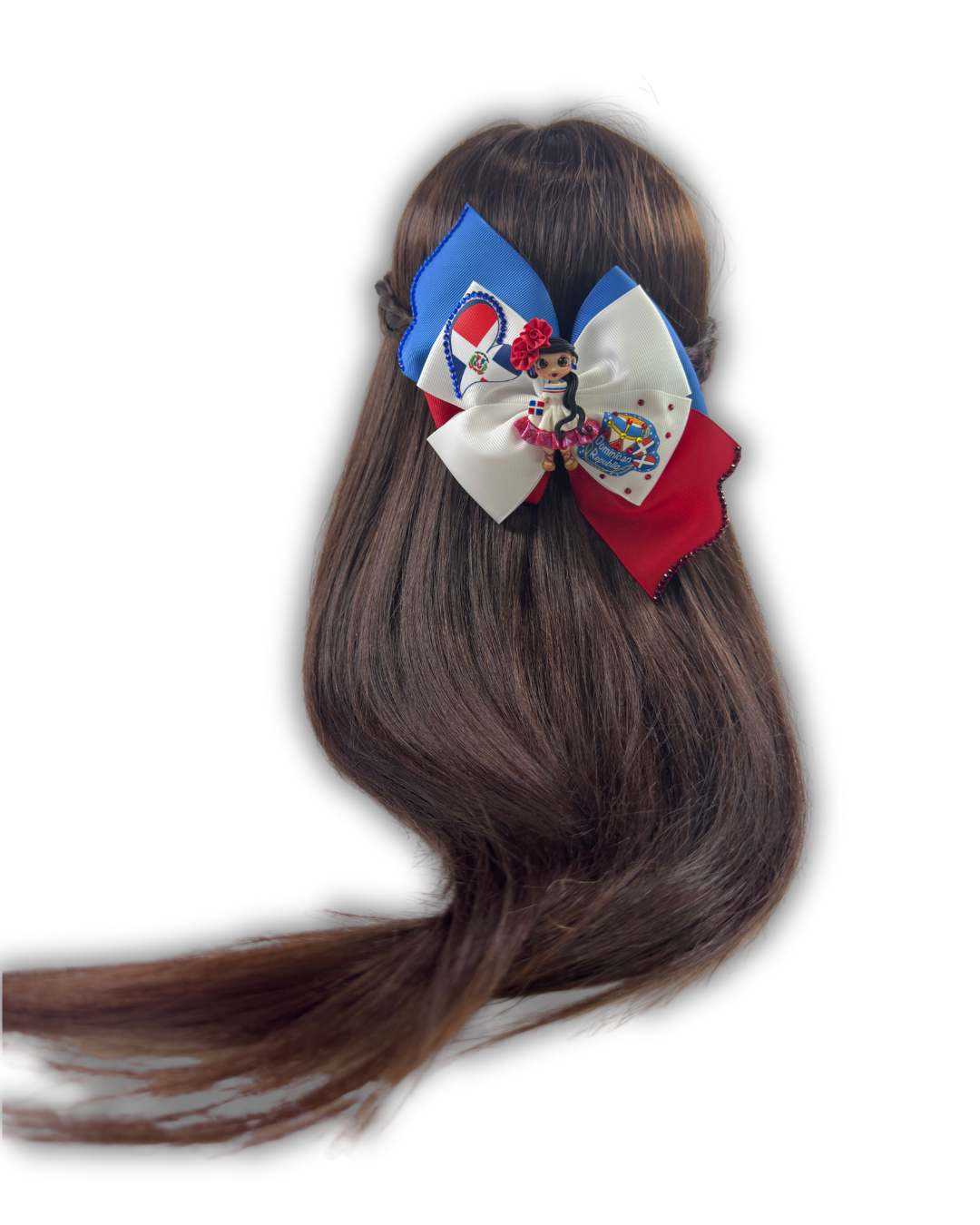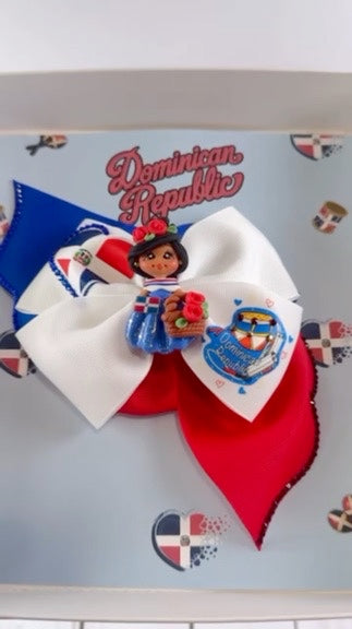 This handmade gift set features a vibrant bow crafted from 2-inch grosgrain ribbon, measuring 5.5 inches wide and 5.5 inches long, including the hanging tails. The design showcases the colors and symbols of the Dominican Republic, adorned with a decorative clay doll, red and blue crystal rhinestones that were attached one by one. It includes a 3-inch alligator clip on the back for secure attachment.