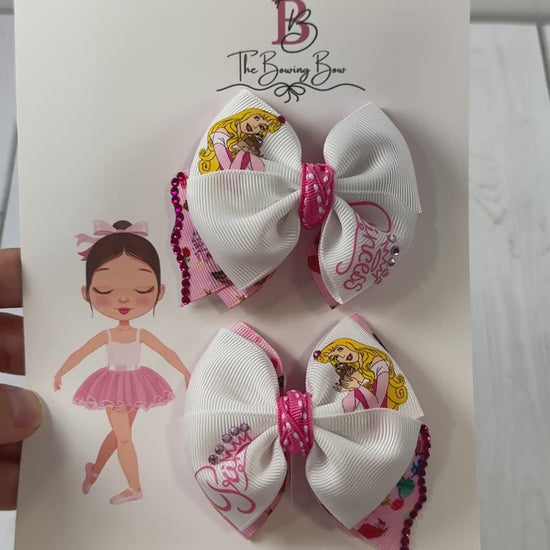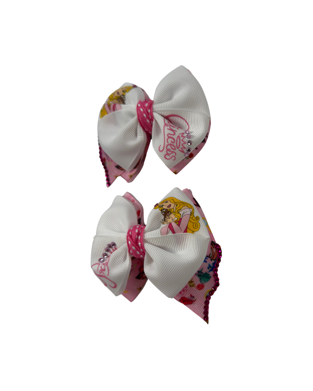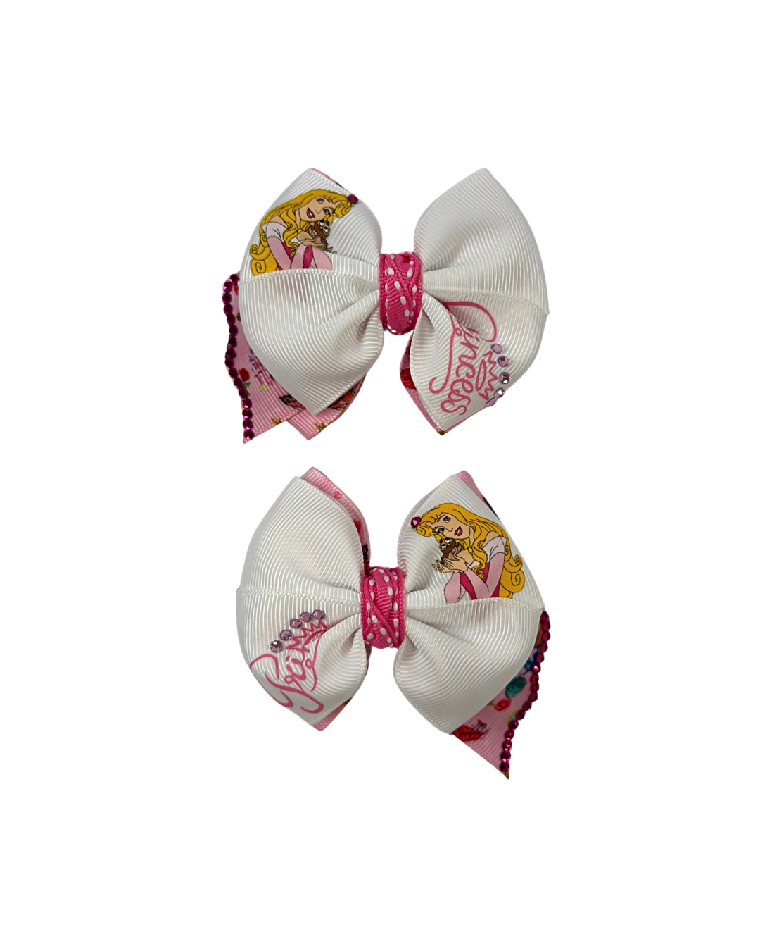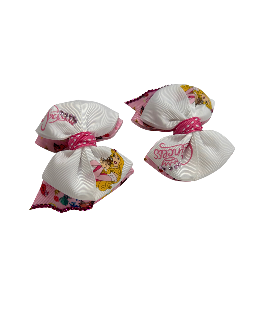 Mini princess Aurora pair of hair bows. Measures 3 inches each and are the perfect size for any age. If you need a nylon headband to wear them on your baby please make sure to add it to your order.