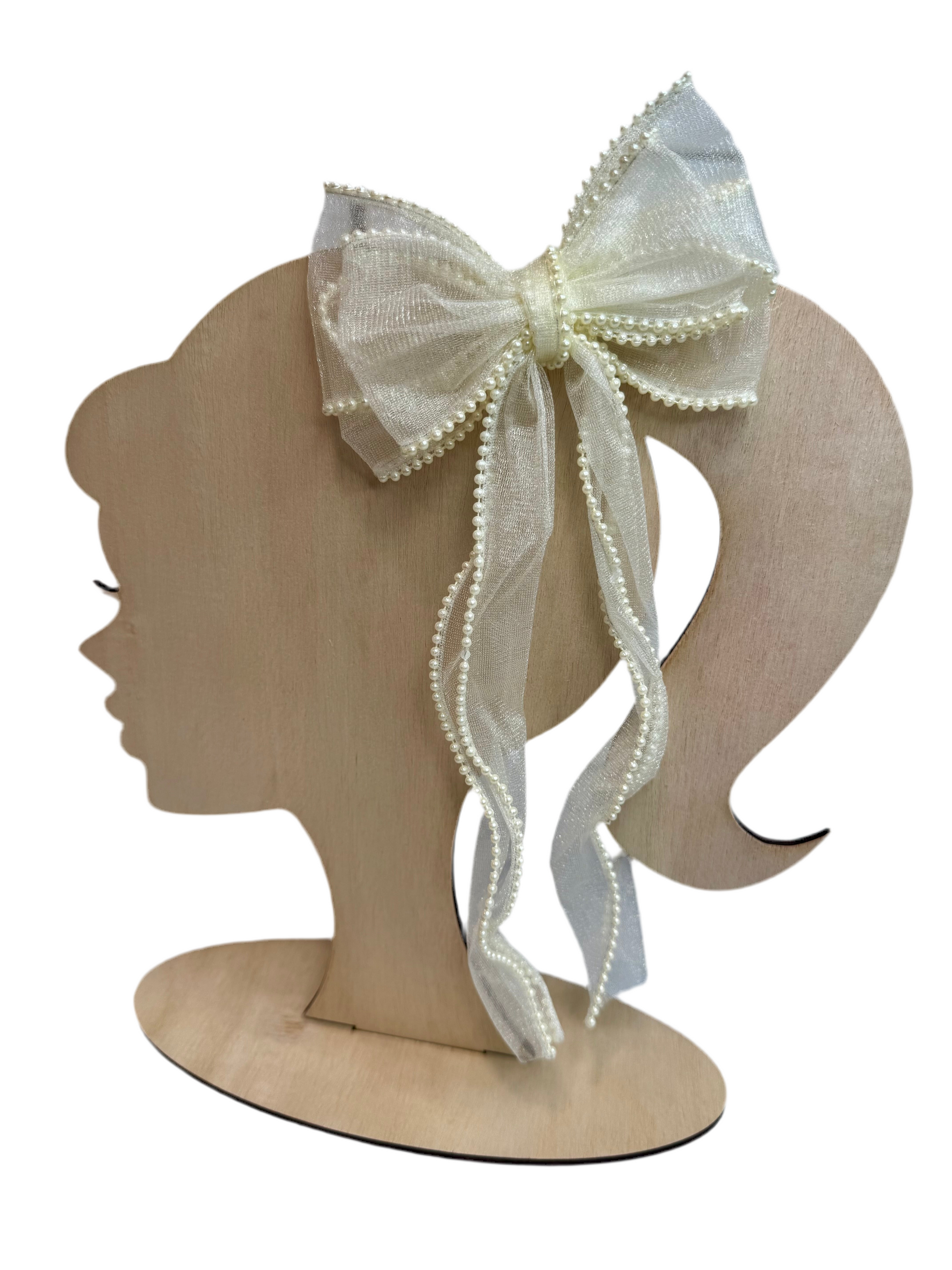 Pearls on pearl is a long tail hair bow with pearl color and pearls around the ribbon. Measures around 5 in and has an alligator clip on the back.