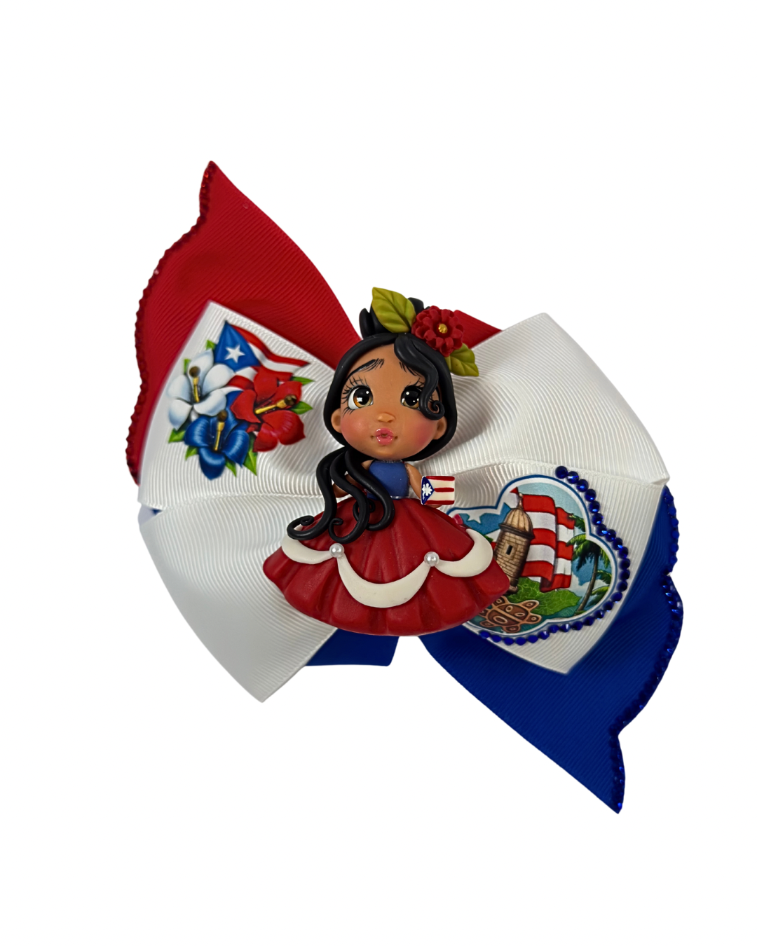 Celebrate your Boricua pride with this stunning handmade bow! Featuring vibrant red, white, and blue layers, sparkling rhinestone accents, and beautiful printed details that showcase Puerto Rico’s culture, this bow is perfect for any proud Puerto Rican.