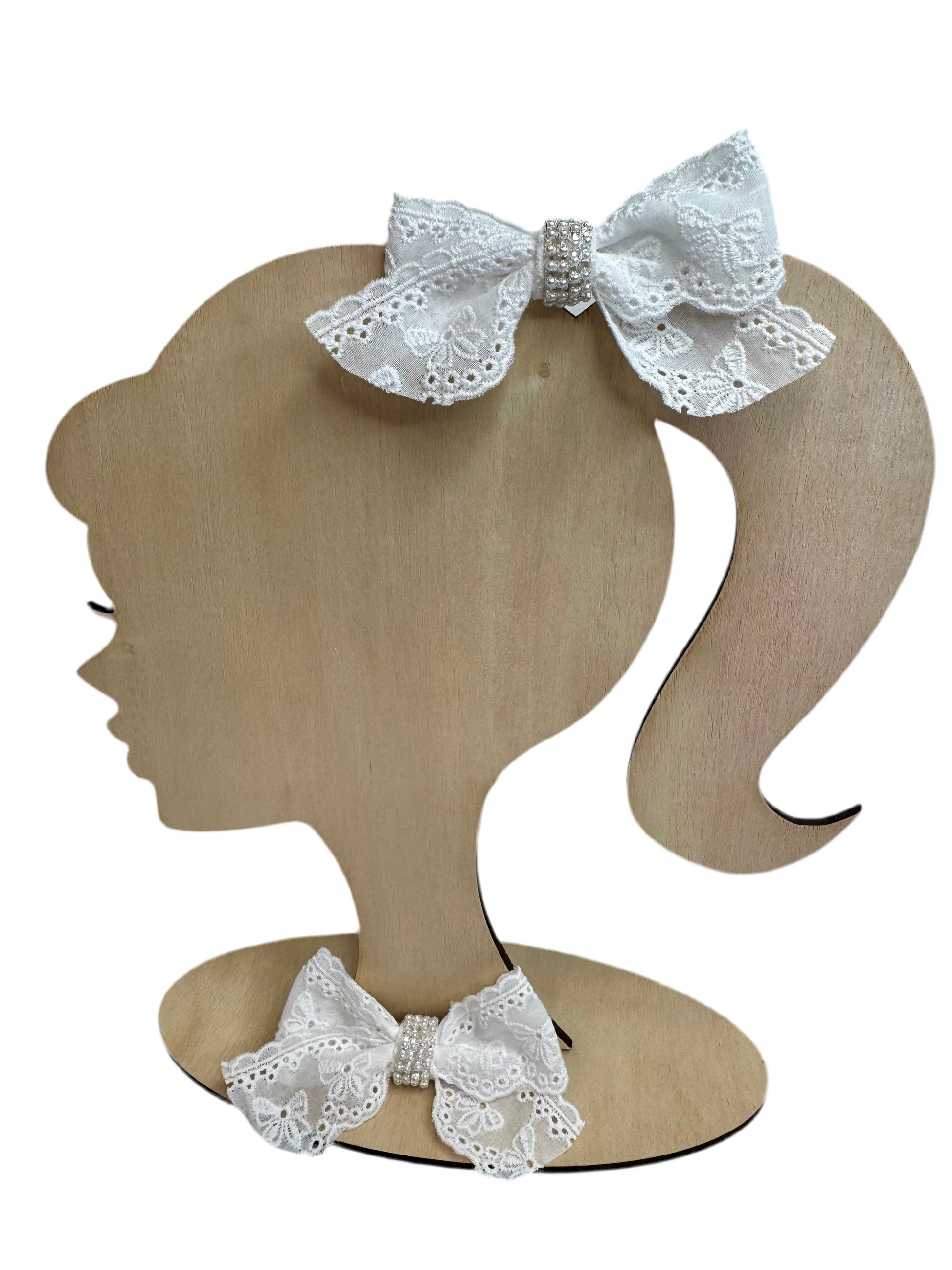 Small pair of lace with pearls. Measures around 3.5 in each.