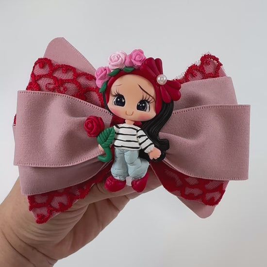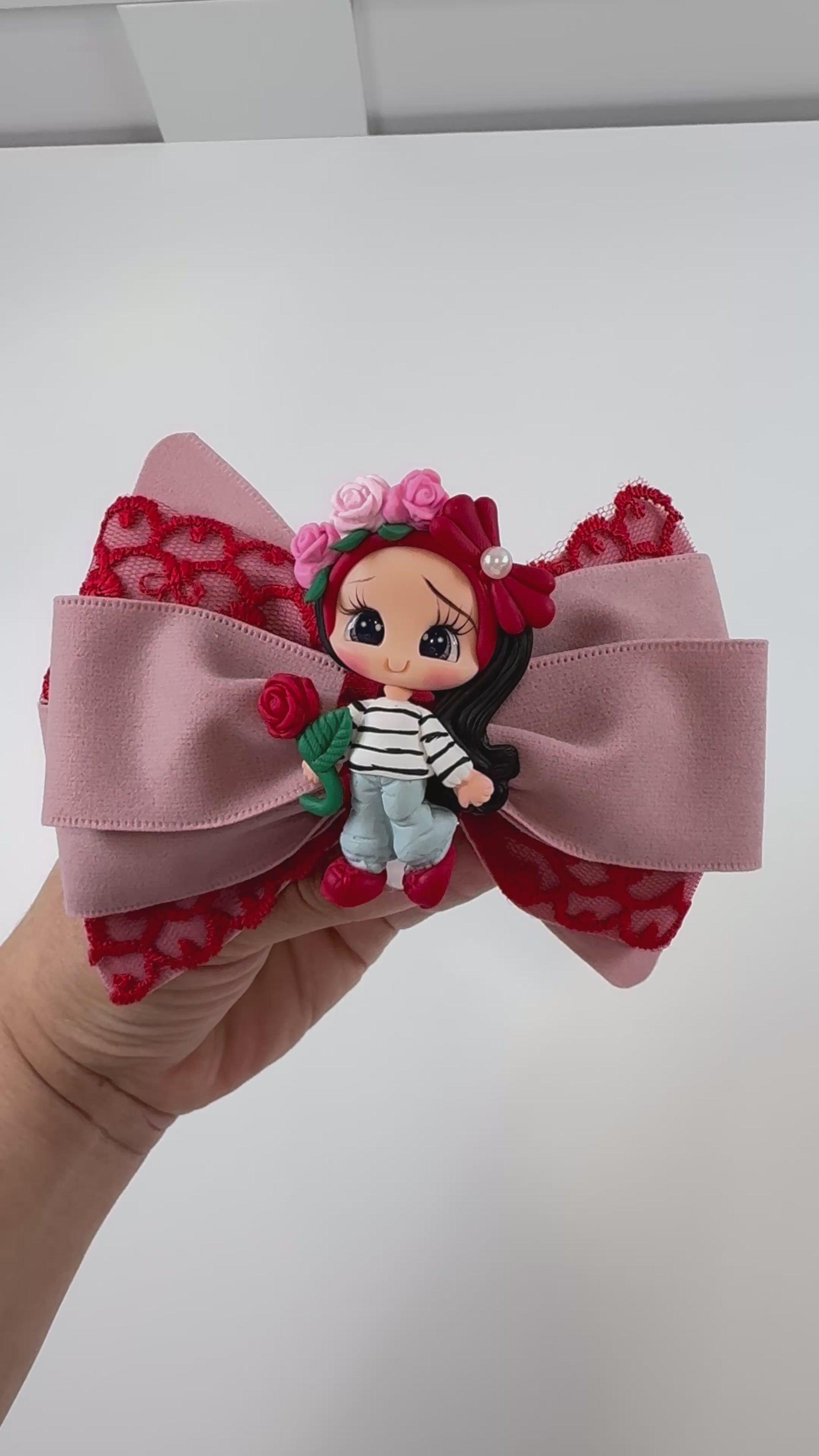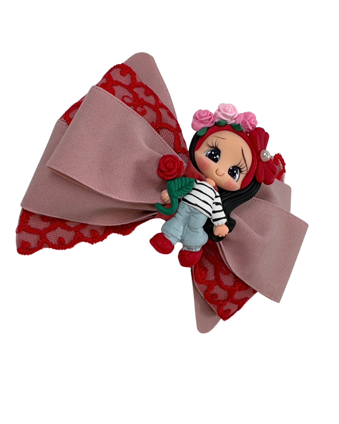 “Meet the Rose Garden Dreamer Bow — a whimsical oversized bow featuring delicate dusty rose and red lace layers, crowned with a charming hand-sculpted clay girl adorned in a floral headpiece and clutching a single red rose. With her sweet expression, pearl accent, and classic black-and-white striped top, this kawaii-inspired accessory adds a touch of romantic fantasy to any hairstyle. Perfect for special occasions, photoshoots, or everyday magic. Handcrafted with love and attention to detail.”