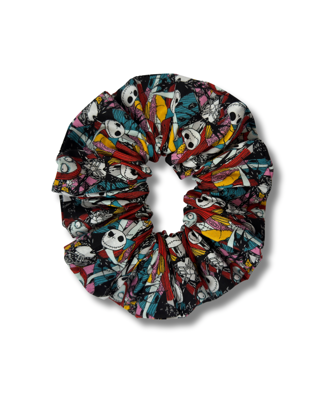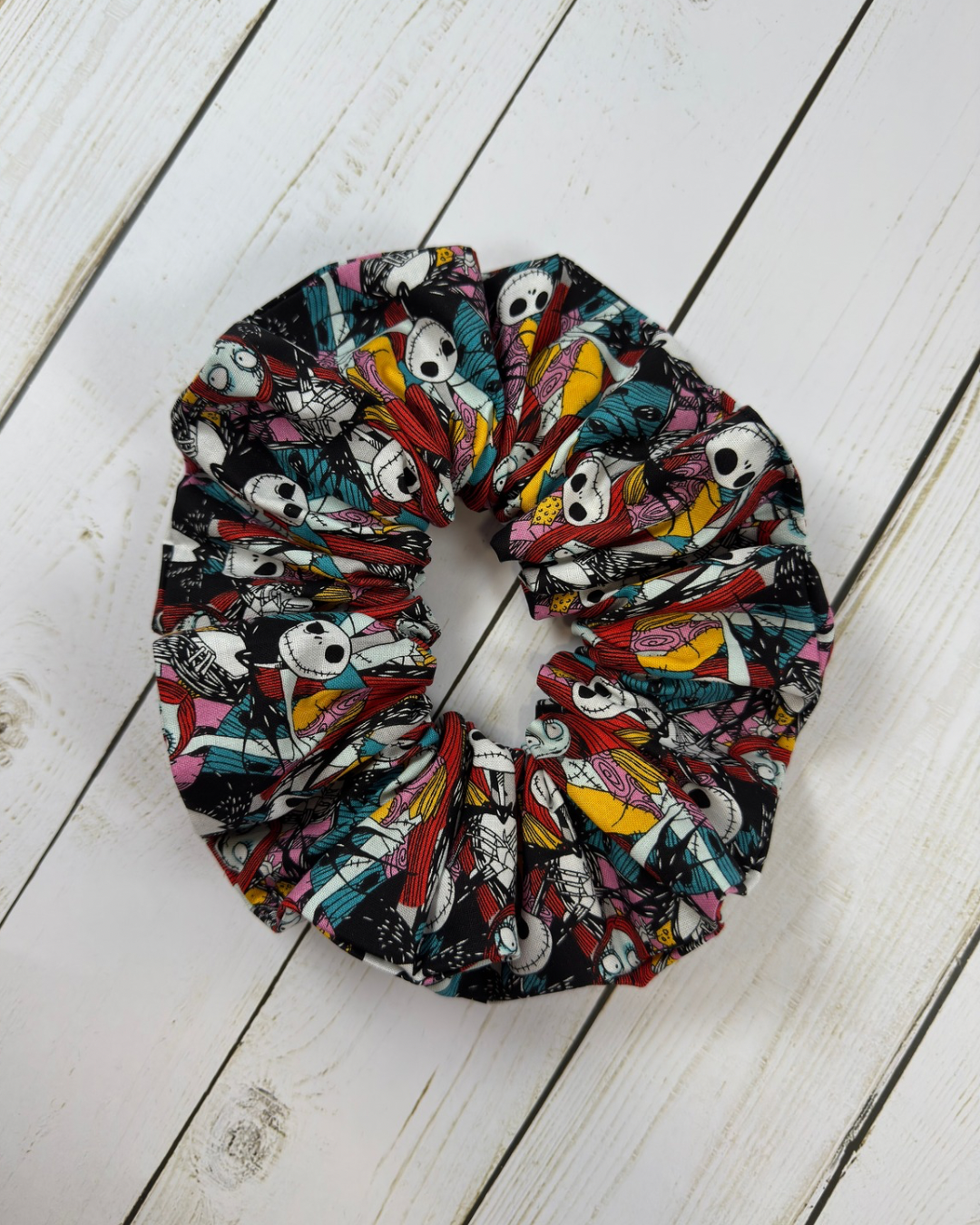 Unleash the spooky charm with this Halloween Scrunchie, adorned with a whimsical array of Jack Skellington and Sally from The Nightmare Before Christmas. Crafted from soft 100% cotton fabric, it features a vibrant mix of black, red, yellow, and teal hues, bringing the eerie yet delightful world of Halloween Town to life. Perfect for adding a festive flair to ponytails or buns, this handcrafted scrunchie stretches approximately 5 inches in diameter and is ideal for costume parties or everyday Halloween fun!